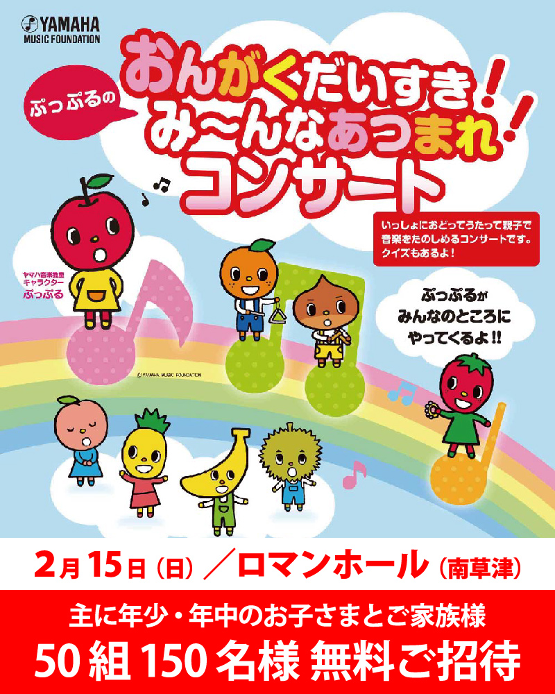 ロマン楽器では、主にこの春、年少・年中になられるお子さまと、そのご家族さまを対象としたコンサート『おんがくだいすき!ぷっぷるのみ~んなあつまれ!コンサート(略称:おんがくだいすきコンサート)』を開催いたします。
